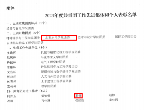 近日,共青团西安理工大学委员会印发《关于表彰2023年度先进集体和个人的决定》,BEAT365官网团委荣获“2023年西安理工大学五四红旗团委”称号,学院团委书记王倩获“2023年西安理工大学共青团先进工作者”称号,水工201等五个团支部荣获“五四红旗团支部”,叶旭获“优秀共青团员标兵”、刘悦等91人获“优秀共青团员”,顾晓蕾等71人获“优秀共青团干部”。