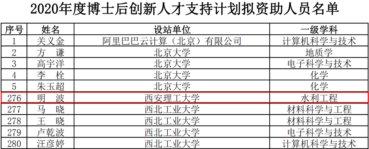 博士后创新人才支持计划,简称“博新计划”,是人力资源和社会保障部、全国博士后管委会新设立的一项青年拔尖人才支持计划,旨在加速培养造就一批进入世界科技前沿的优秀青年科技创新人才,是我国培养高层次创新型青年拔尖人才的又一重要举措。“博新计划”结合国家实验室等重点科研基地,瞄准国家重大战略、战略性高新技术和基础科学前沿领域,每年遴选400名应届或新近毕业的优秀博士,进入国内博士后设站单位从事博士后研究工作,国家给予每人63万元的经费支持。此次全国400名入选者中来自水利工程学科的仅5名,西安理工大学、清华大学、武汉大学、大连理工大学、河海大学各获选1名。