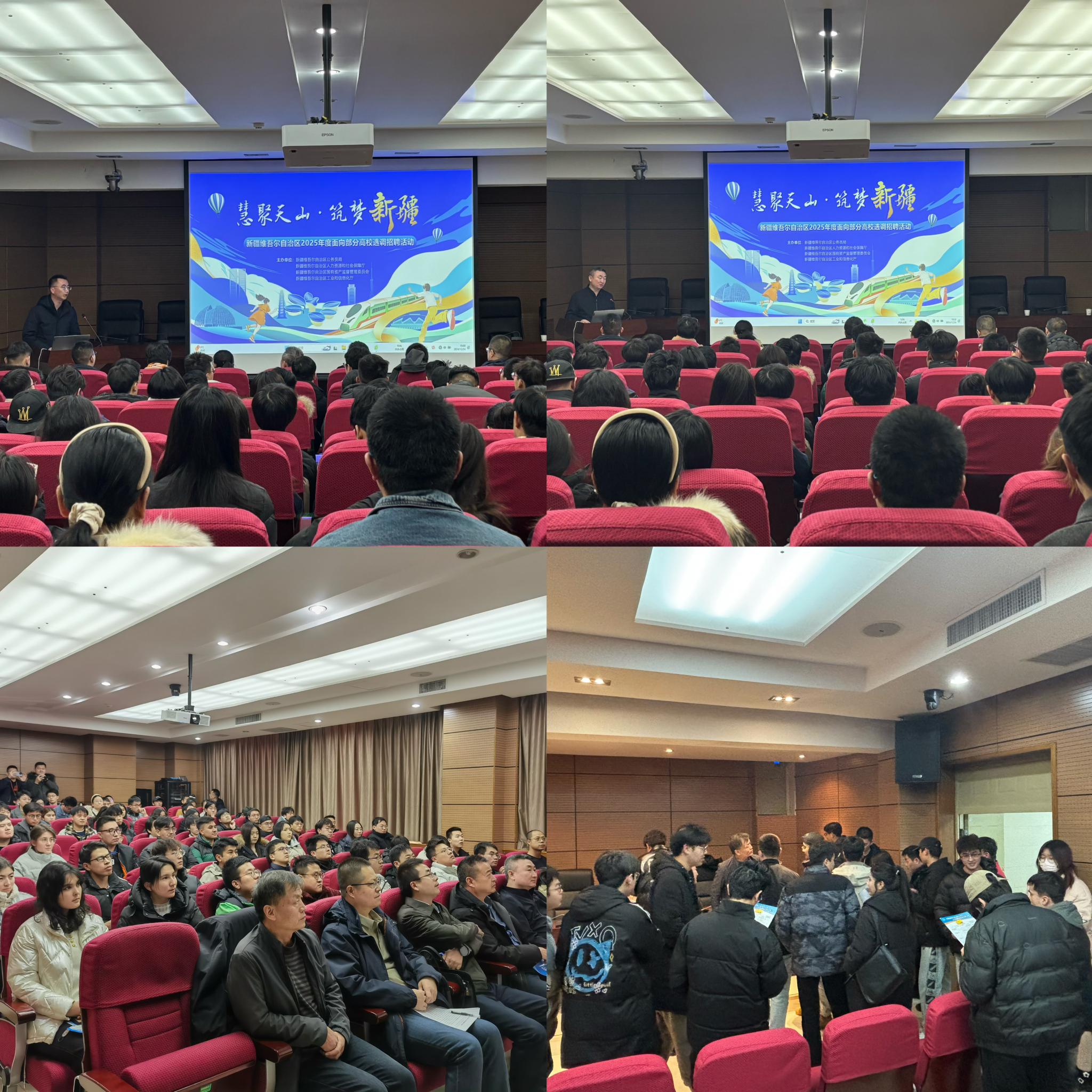 九家用人单位分别介绍了各自单位的特色优势、岗位设置、福利待遇等,大家共同观看了《新疆是个好地方》《来吧!我在新疆等你》《单位简介》等三部宣传视频,使同学们对招聘岗位有了更直观、全面的了解。