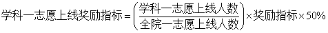 (1)一志愿上线奖励指标:根据当年一志愿上线考生人数各学科在全院的占比进行计算,即: