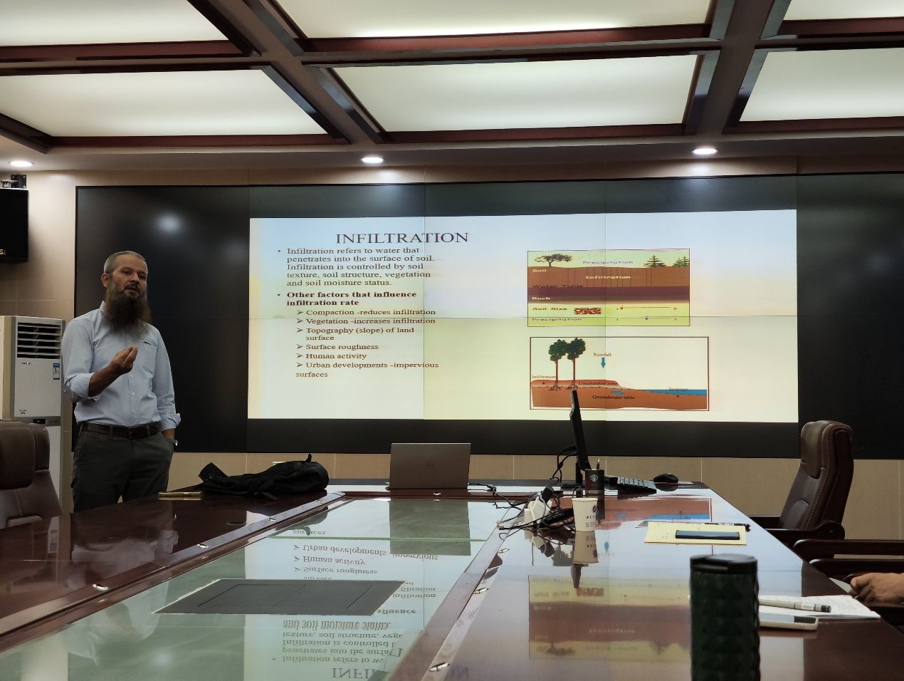Mohd Yawar Ali Khan副教授从水文地质学为视角,系统阐释了地下水及其动力学过程。讲座伊始,他通过土柱模型生动展示了地下水垂直分层结构,深入浅出地解析了包气带与饱水带的形成机制及其水文特征。随后,他重点剖析了控制地下水运移的关键土壤参数,为了强化对理论的理解,Mohd Yawar Ali Khan副教授结合人工井取水动态模拟与湿地演化案例,直观揭示了地质水文过程的作用机理。在互动环节中,他通过启发式提问与师生就地下水赋存条件、孔隙度影响因素等议题展开深度研讨。这次学术报告深化了听众对学科核心概念的理解,为相关研究提供了跨文化的学术视角与方法启示。