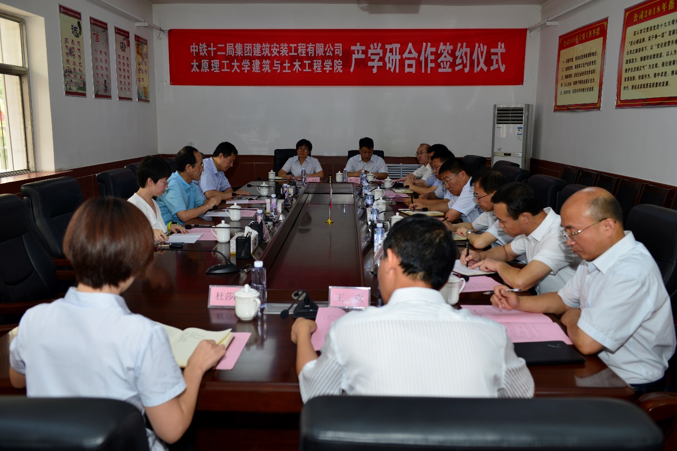 2018年7月8日上午10点,威尼斯87978797建筑与威尼斯87978797与中铁十二局集团建筑安装工程有限公司在建安公司会议室举行产学研合作框架协议签署仪式及产学研合作揭牌仪式。建筑与土木工工程学院院长雷宏刚教授、土木系主任董晓强教授、土木实验中心主任刘元珍教授,中铁十二局集团建筑安装工程有限公司董事长、总经理蔡英康、党委书记姜振生、公司副总经理、总工程师王中军、副总经理卢会永、副总工盖宏、副总工解明旭、副总经济师李勇、科技部副部长范伟、科技部副部长王美静、测试中心副主任王欢、科技部部员杜莎莎出席了签约及揭牌仪式。