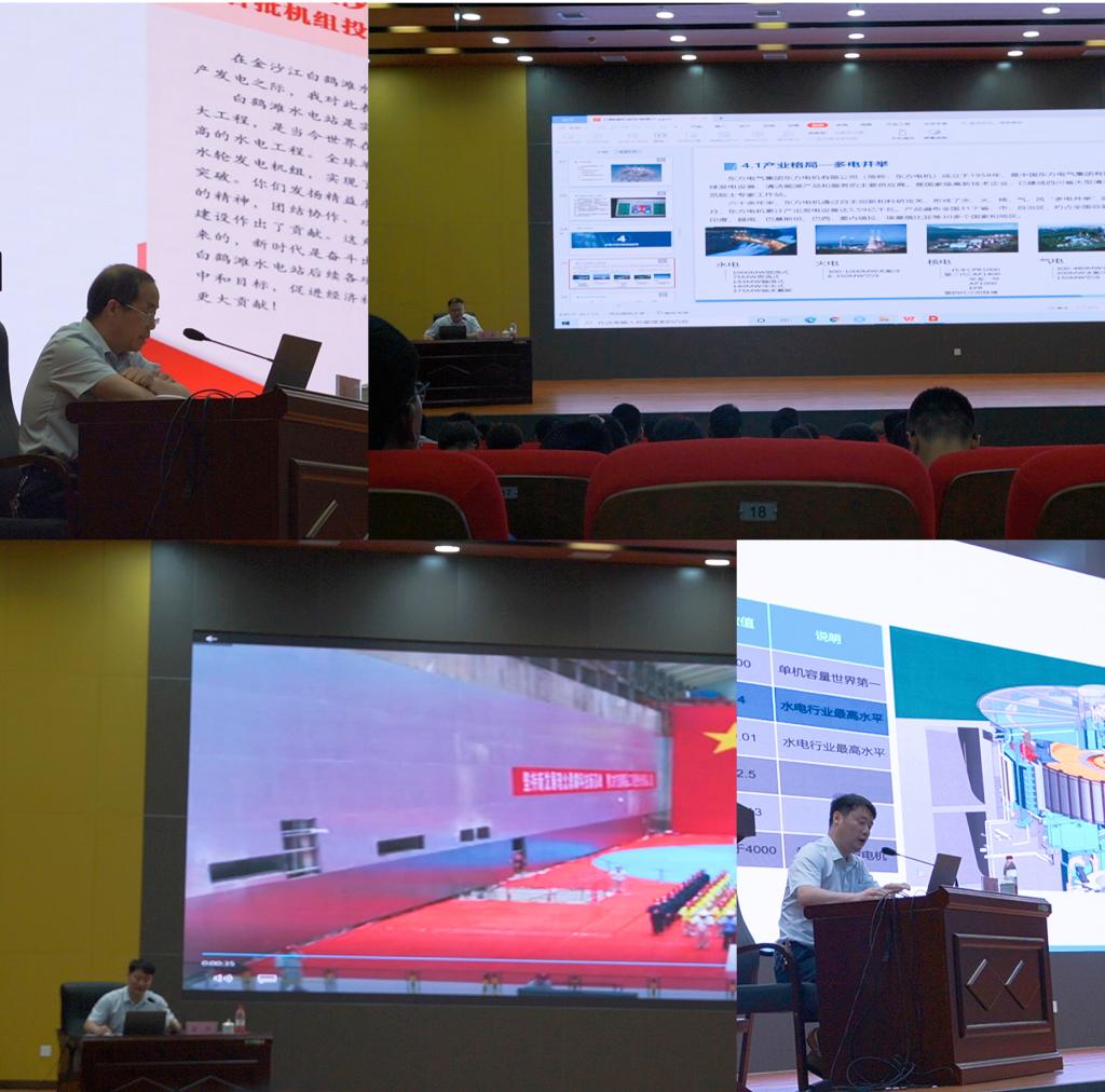 随后,王钊宁以“大国重器白鹤滩水电工程”为题,宏观的介绍了白鹤滩水电站在我国“西电东送”计划中的重要作用和在我国构建清洁低碳、安全高效的能源体系中的关键地位。之后,他带领学生学习了2021年6月28日习近平总书记发表的“致金沙江白鹤滩水电站首批机组投产发电的贺信”,希望学生们能积极投身水利事业,在新的挑战中修炼艺术家般的灵性,锻造钢铁般的斗志。