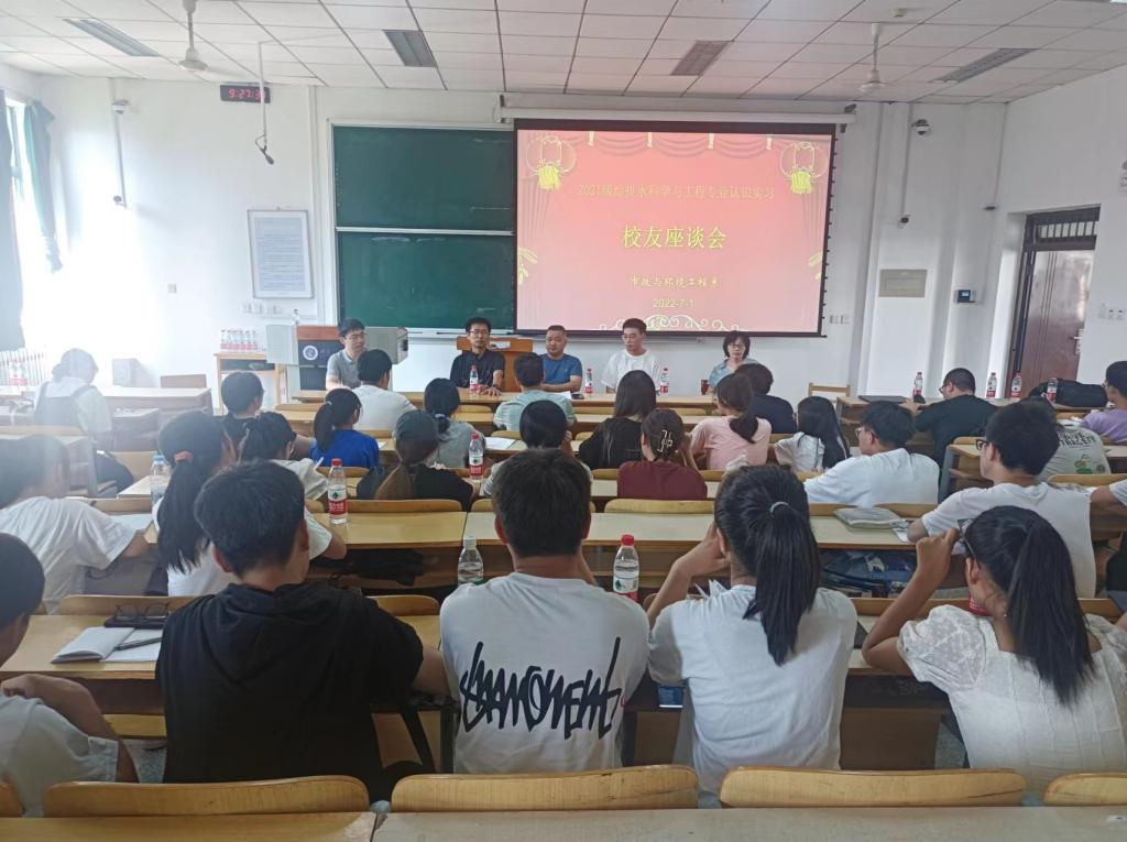 王东琦首先对两位校友和优秀毕业生代表做了简要介绍。曹俊峰、卢科锋两位校友结合自身学习和工作经历与在座老师、同学开展深度交流,介绍了当年的求学过程,工作后对专业新的认知和感受,为同学们分析了给排水专业的工作内容和发展前景。希望同学们珍惜现在良好的学习条件,在学习、工作中保持一颗平常心,脚踏实地,积累沉淀,做好本职工作。优秀毕业生陈凯结合自己四年的学习感受,从课程学习、参与科研、科技竞赛等方面与同学们充分互动,分析了如何在繁杂的信息资源中获取有效信息,如何以自律的学习、生活状态度过大学时光。