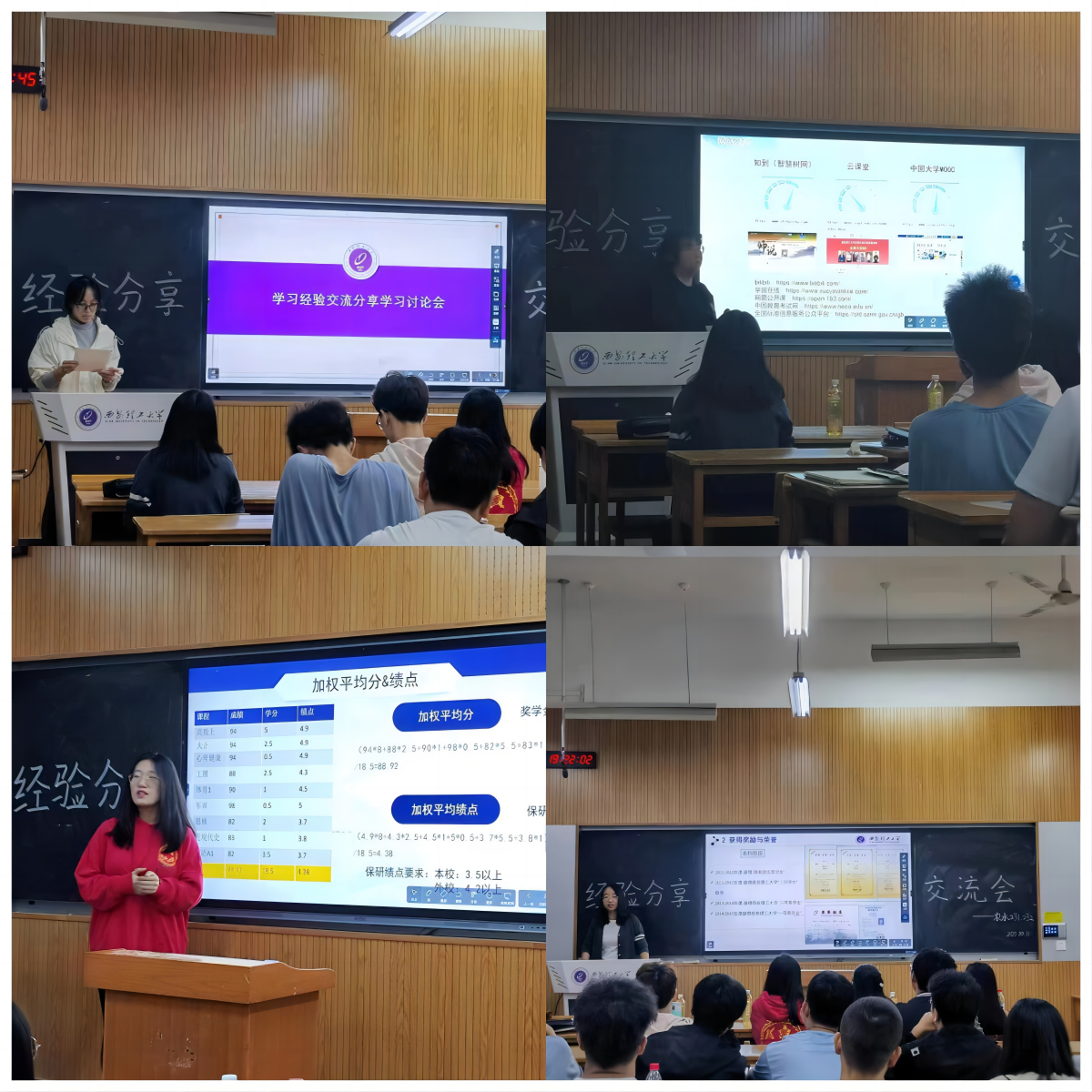 活动开始,韦开学姐表示,大学期间考取四、六级证书和提升个人综合能力素质非常重要,希望大家能够提早规划。杨二娟学姐细心讲解了加权平均分和绩点的计算方法,激励大家积极参加各项竞赛。车嘉佳学姐分享了学习和时间管理的高效方法,希望各位同学都能够成为全面发展的优秀人才。景勇学姐建议同学们不能盲目考证,切忌随波逐流,要确立好属于自己的目标。各位学姐们还向同学们展示了各自大学期间所获得的证书和奖项,并表示希望大家可以借助各项活动、竞赛来丰富自己的校园生活。随后在自由交流环节中,多名同学向学姐们咨询了入校以来的些许困惑,在学姐们的细心讲解下,大家的疑惑得到解答。最后在活动的结尾,导师以讲解保研资格的要求与条件为引子,温馨提醒大家要提前做好相关规划,鼓励同学们刻苦努力、踏实求学、勤奋上进,力争做一个对行业、社会、国家带来积极贡献的有为青年。