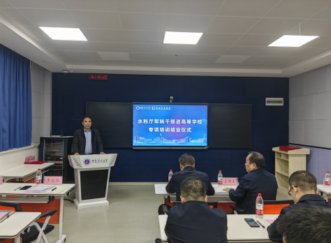 10月23日,陕西省水利厅军转干部进高等学校专项培训结业仪式在BEAT365官网金花校区教一楼303举行。BEAT365英国官网党委书记王瑞生,实验室管理处副处长吴罗长,学院党委副书记李永阳,学工办主任杨帆,授课教师代表吴军虎、任杰、宋志强,以及本期培训学员参加了结业仪式。